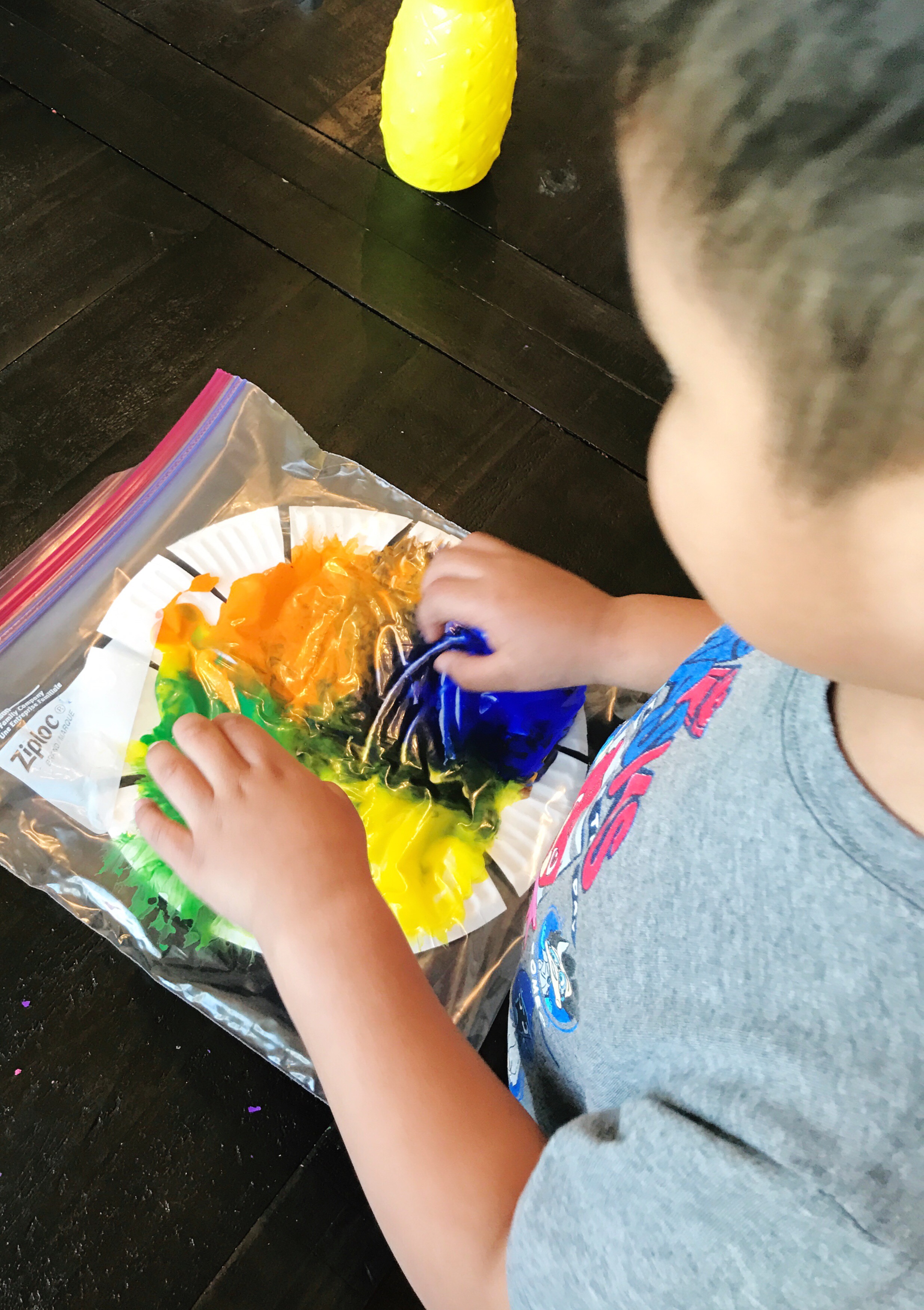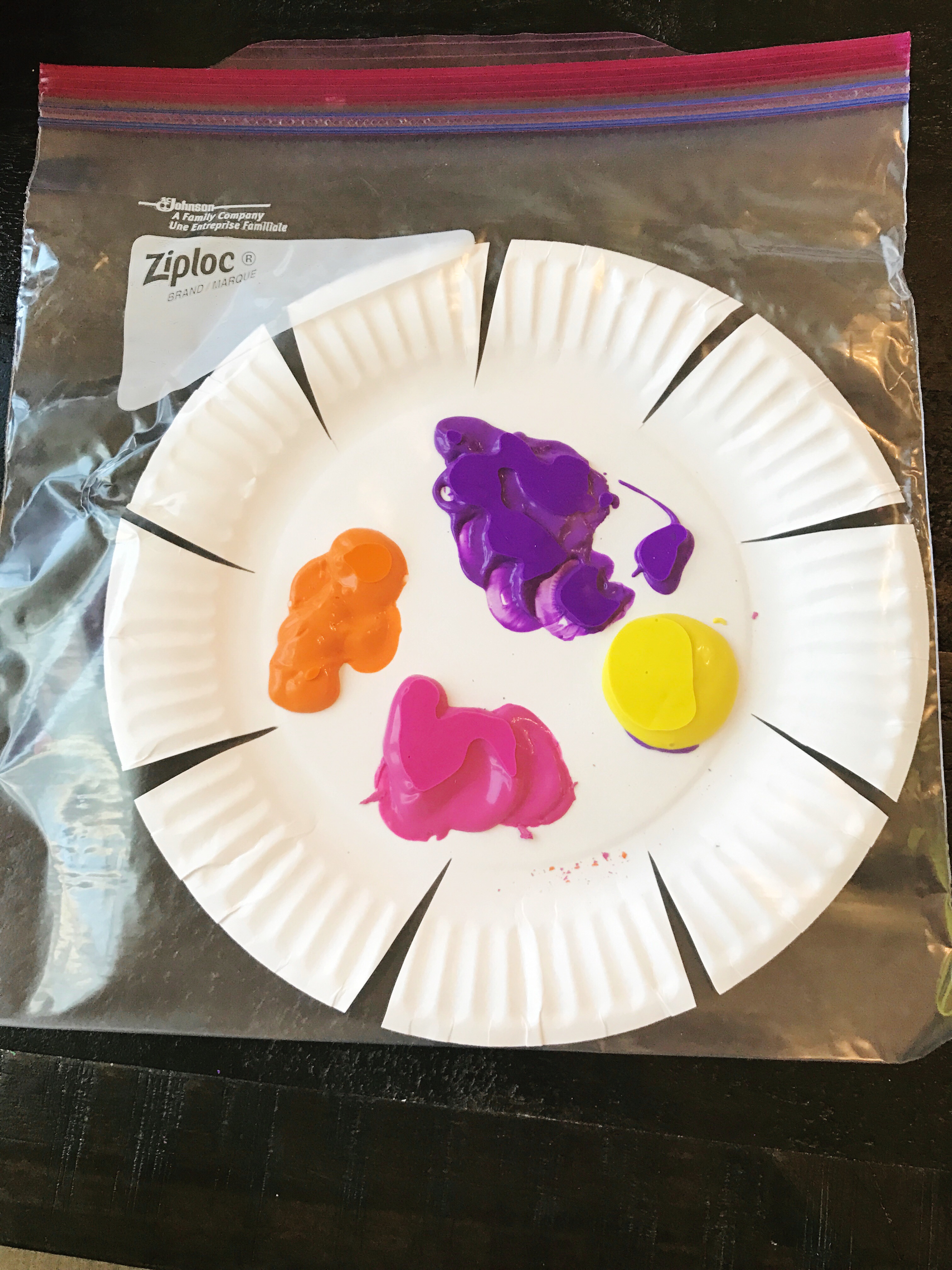 Place the paper plate in the ziplock bag and allow child to smash the paint on to the flower